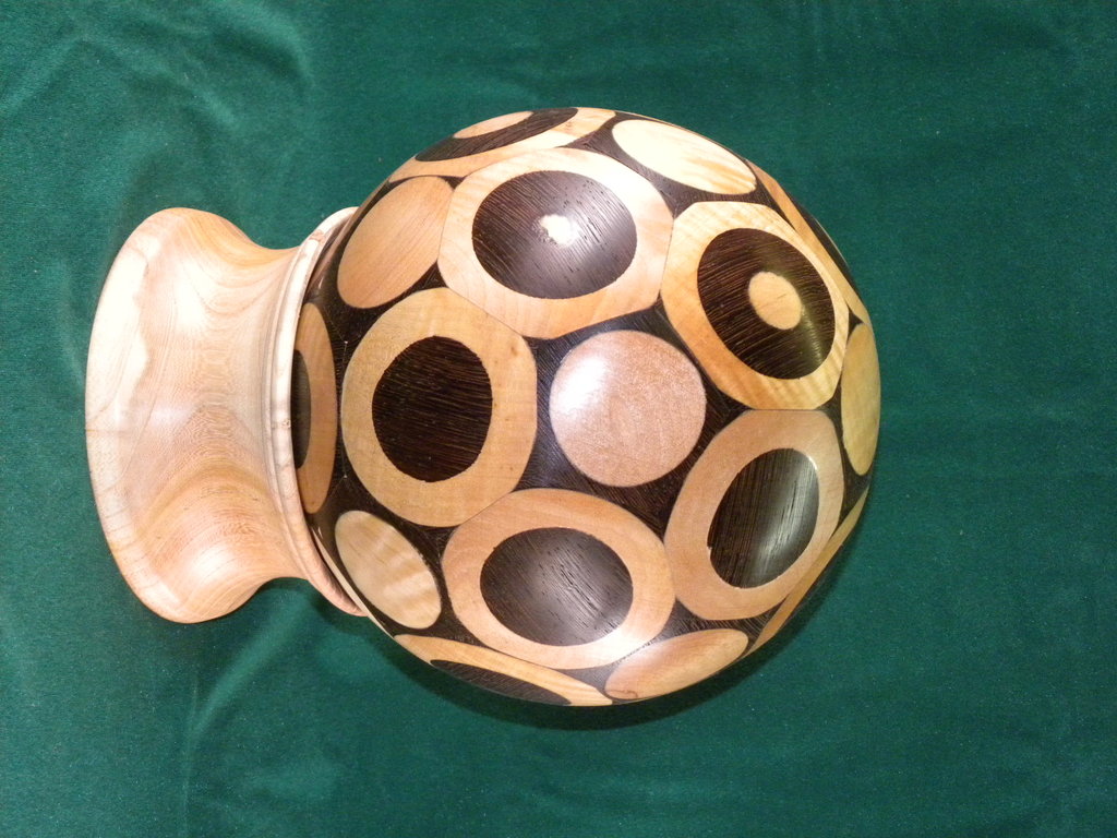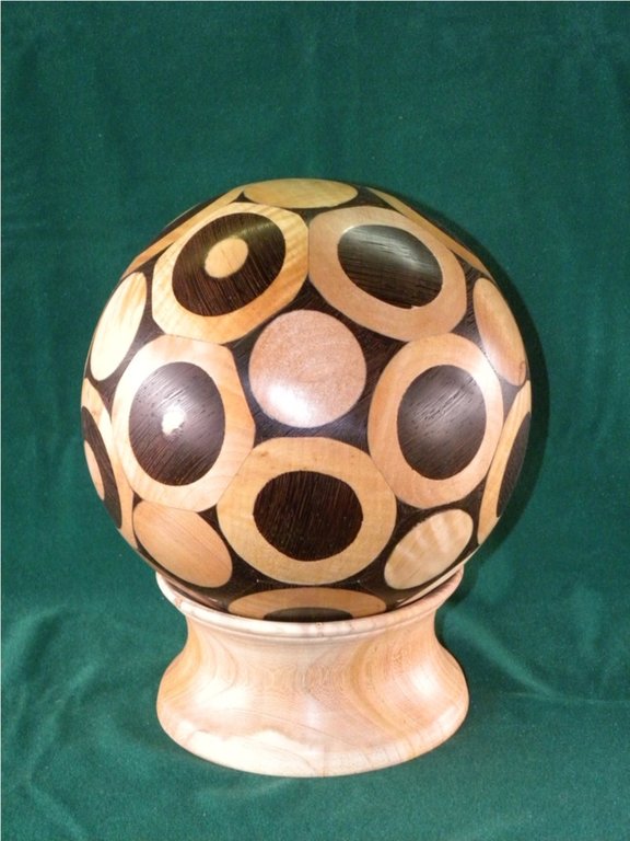正6角形と正5角形の板を接着し、32面体を作り、これを丸く削ってオブジェを作ってみました。板はウェンジュとその他の白っぽい板を、計5枚合板状に接着しておきました。