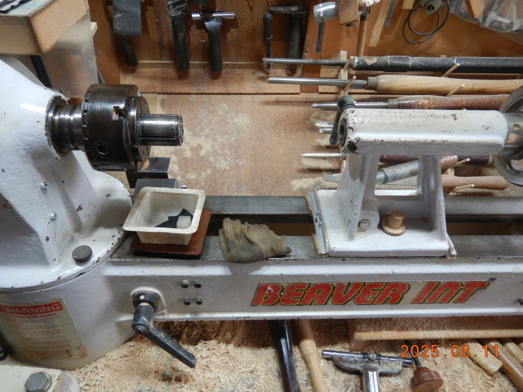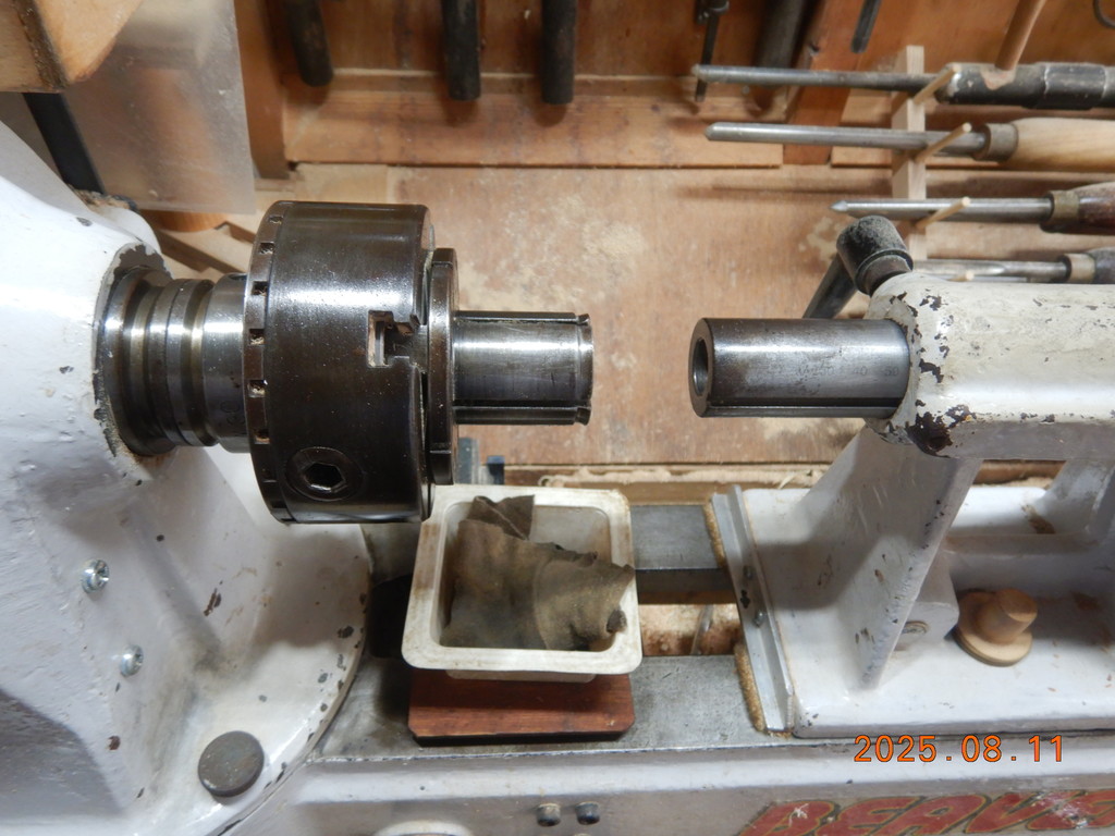 木工旋盤、この暑さと湿気ですぐに錆びます、梅雨時はそれほど錆びませんでしたが今は厚さと湿気でより錆びるような気がします、使用後はチャックやテールストックバレルに油を塗っています