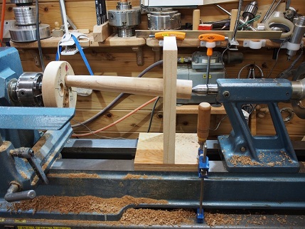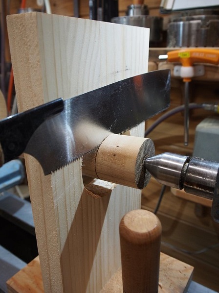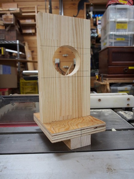 2025年2月10日(月)偏心脚直角出しジグ木工旋盤で偏心脚を作る上で難しい箇所は、座板にはめ込む部分を旋盤のセンターラインに対して直角に削ることです。ここがうまく行かないと、座板との接合部分に隙間が生じてしまいます。刃物を直角に当てているつもりでもだめな時があるので、対策としてジグを使って鋸で直角に切るようにしました。@ 全体の形です。A 旋盤に取り付けた状態です。B この板が軸に対して直角になっています。C この板に鋸刃を当てて切ると偏心脚に直角の切り込みが できます。脚を手で少しずつ回して切ります。D このように直角に切り込みが出来ました。 続きを読む 折りたたむ E あとは旋盤の刃物で座板の穴の径まで削ります。F このように、座板に隙間が出来ずに収まりました。