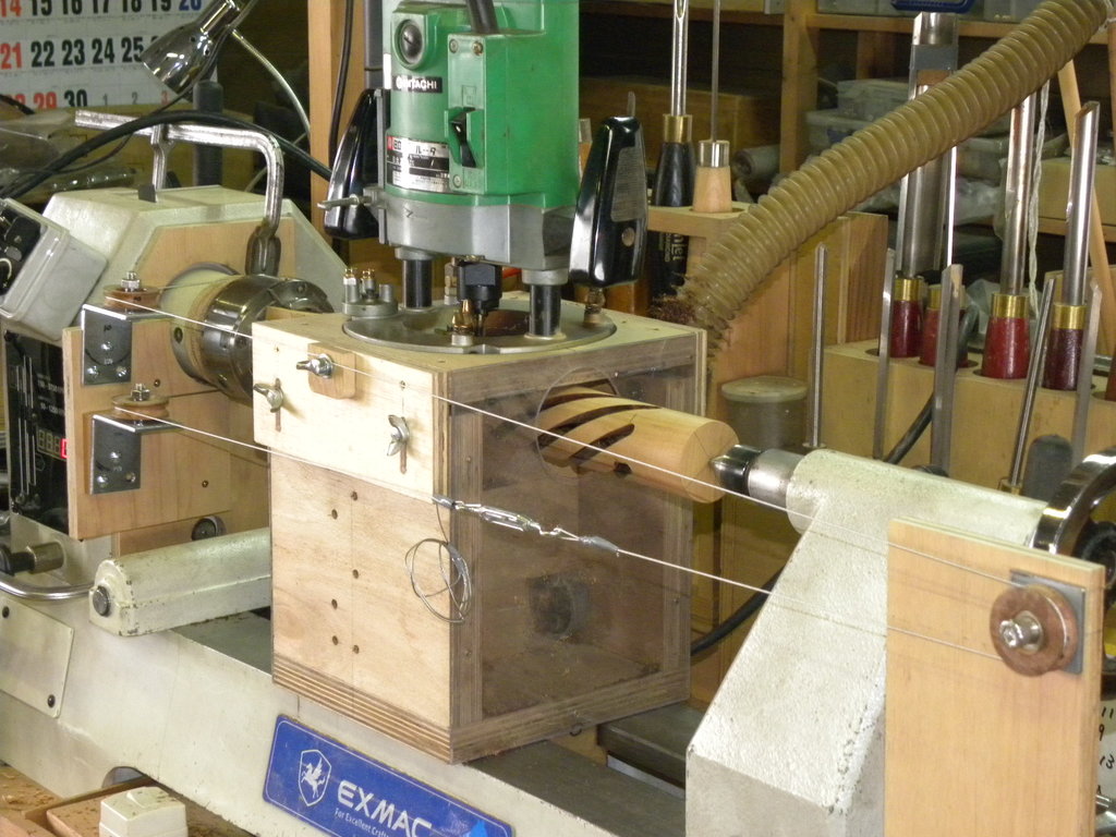 スパイラル加工のための治具を作りました。外国の方が簡単そうに見える治具を使って、スパイラル加工をしている動画がユーチューブで見られました。自分も真似して治具を作ってみました。当初はうまくいかなかったのですが、何点か改良を加えたところ、一応スパイラル加工が出来ました。桜材で径50ミリの丸棒を挽き、径8ミリのビットで、6条のスパイラル加工をしてみました。