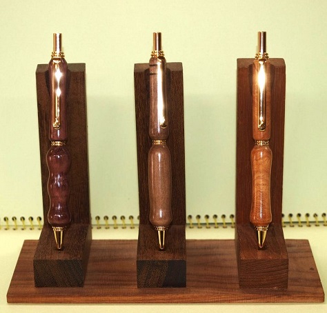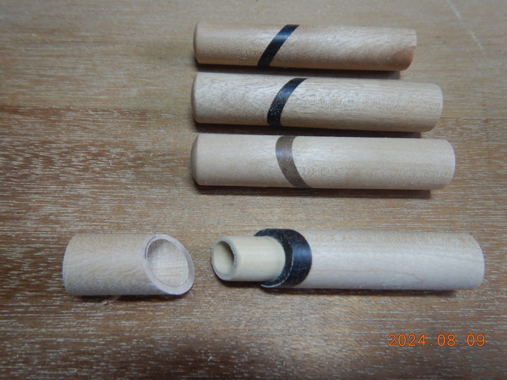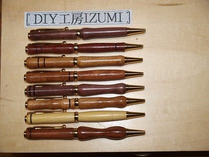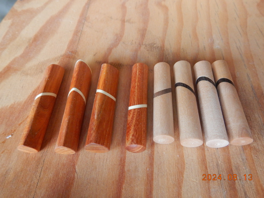 2024年8月4日(日)ファミリーでペンづくり今日は群馬県の高崎市から、ファミリーがお見えになりました。ネットを探して、マイ工房にたどり着いたとのことで、ありがたい事です。中2の 息子さんとご夫婦の3人で、シャーペンを作りました。お母さんはパープルハート、お父さんはウオールナット、息子さんはカリンの杢で作りました。3人とも初めてでしたが、見事な作品に仕上がりました。