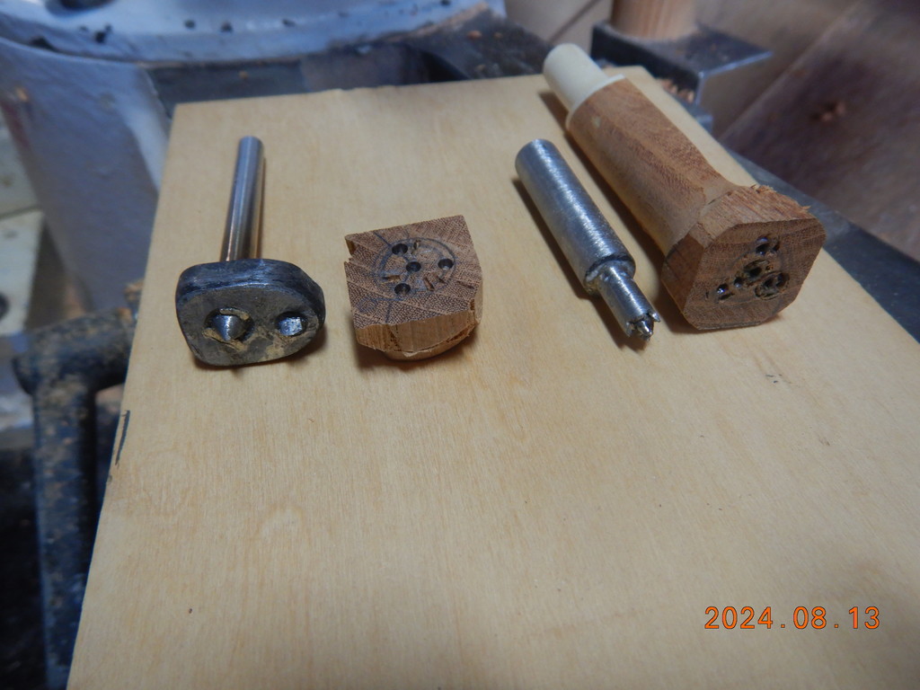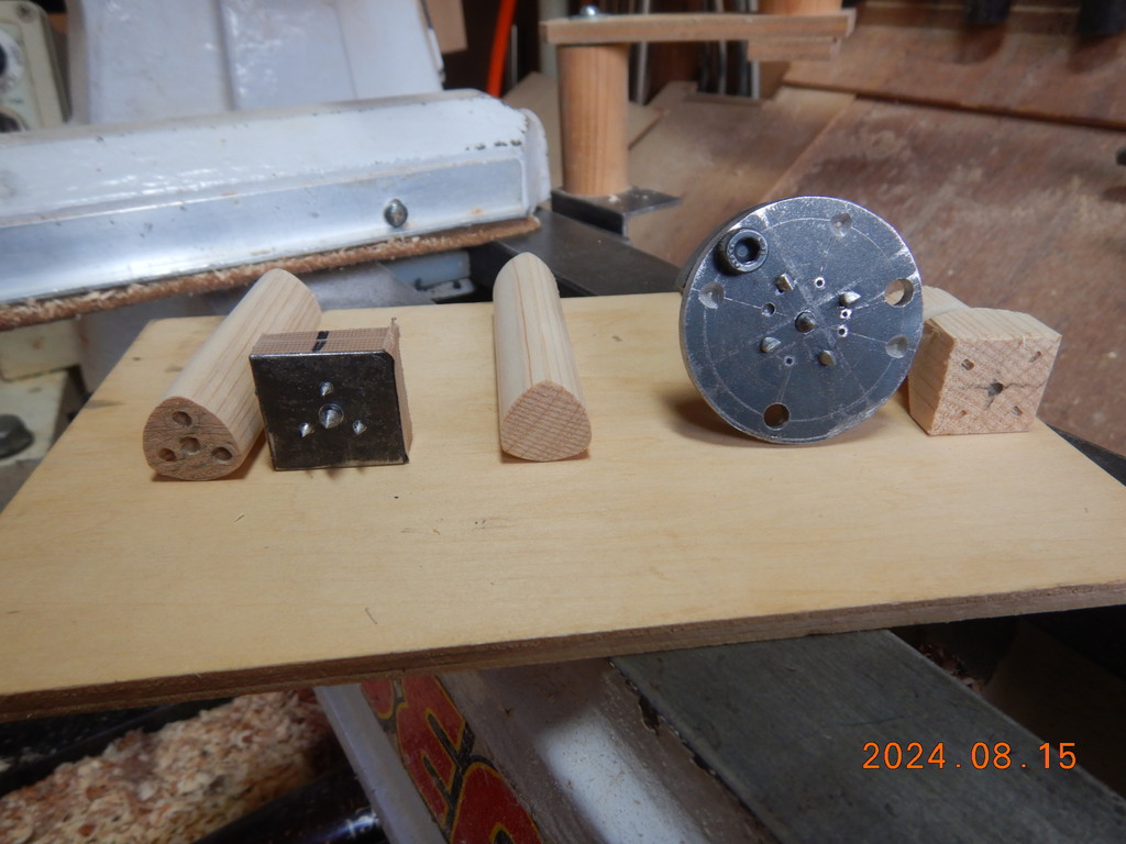 山下式楊枝入れ三角形小径のドライブセンターを作り試みるが失敗、写真右考えに考えました強制思考です、その結果写真左のドライブセンターです、加工後の再加工も同じところに取付できます