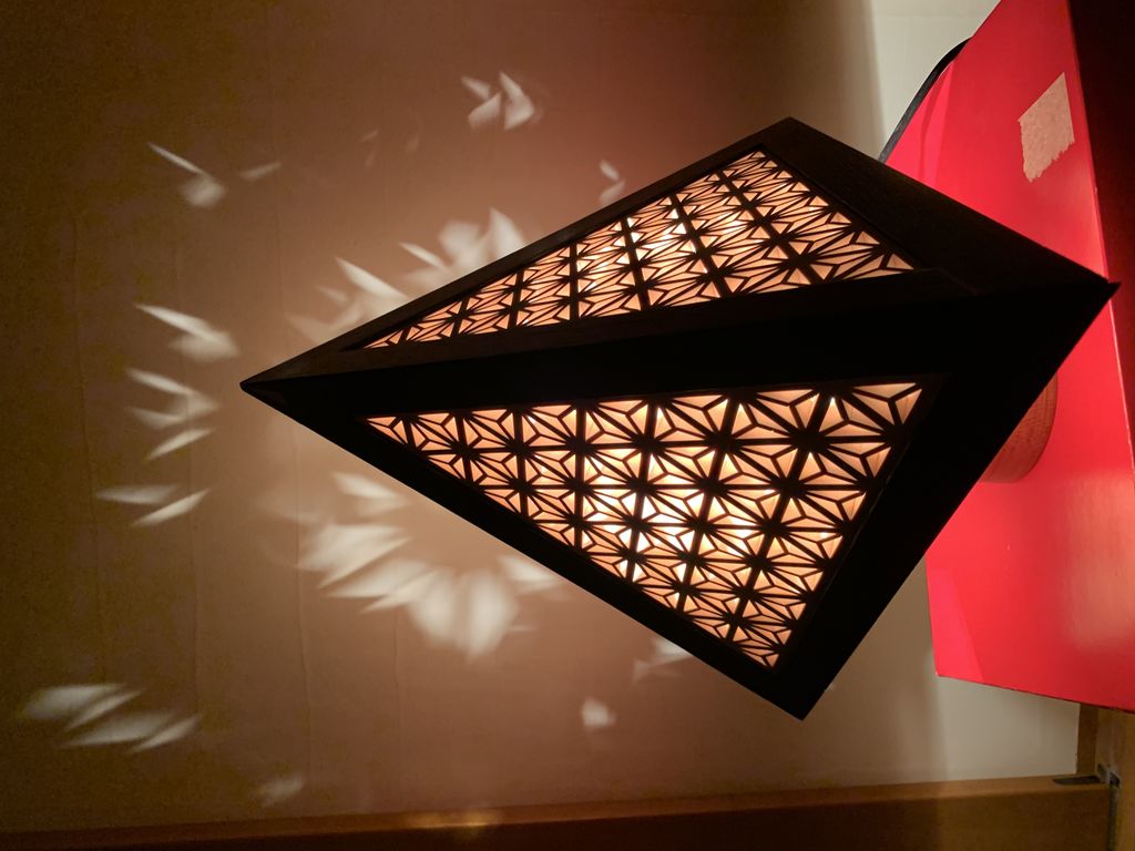 今年は木工旋盤から離れ組子に熱中しておりました。You Tubeで見た麻の葉ランプを作りたくなって、組子作りを一から始め試行錯誤の末なんとか作れるようになりました。組子はとても奥が深く、まだまだ追求すべきところがありますが、目標だった正三角錐の枠に麻の葉模様の組子をはめたランプが出来ました。この掲示板にはふさわしくないかもしれませんが、電球を乗せる台座部分だけが欅材をロクロ加工したというところでUPさせていただきました。組子は檜材、黒枠は栗の木に拭き漆をしました。