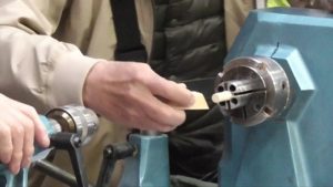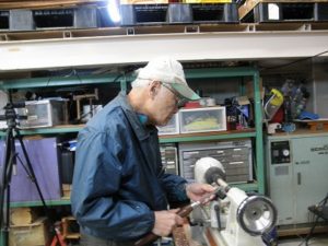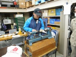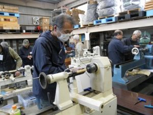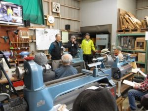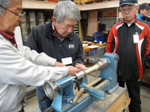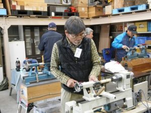 午前には参加会員の28名が「偏心楊枝入れ講習」の後、事務局にて用意した実習用事前組み込み材をターニングしました。