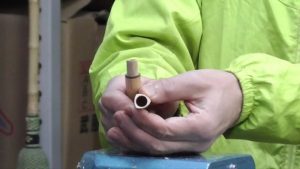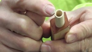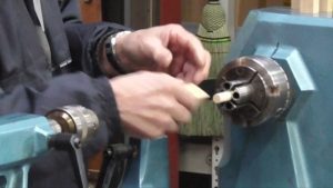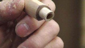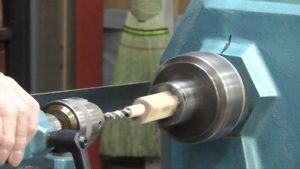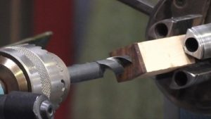 飾り付き部材に丸棒挿入接着後8.5ミリドリルで深さ65ミリの穴あけ準備 中心を確認 |